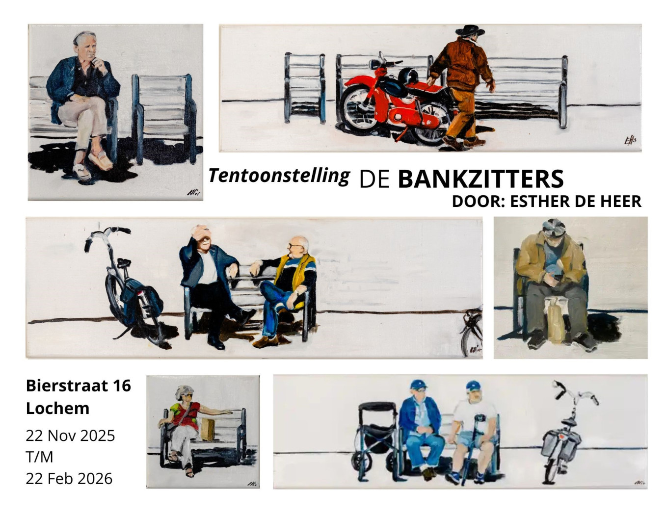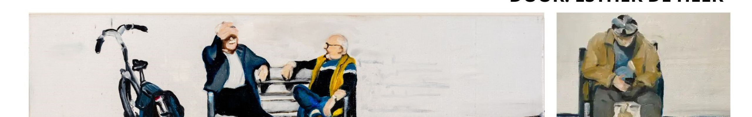 Het nieuwe project van Esther is ontstaan doordat ze van uit haar atelier op de kleine markt in lochem kijkt en daar anoniem en bijna op voyeurachtige wijzen ziet hoe touristen daar ijsjes eten. De lochemers gezellig zitten te keuvelen met vriendinnen in het zonnetje, kinderen die spelen en moeders met kinderen. de mannen die wachten totdat hun wederhelften terug komen van de boodschappen. En om gestalte te geven aan het intieme tafereeltje zijn de maten van de doekjes daarop aan gepast. Een intieme ontmoeting toevallig of niet.